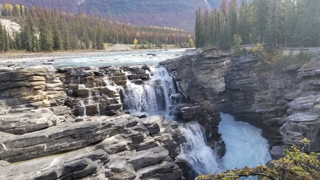 Athabasca Falls in Jasper National Park is where I would say I feel safe and happy. The 23 metre high falls is one of the most powerful falls in the mountain parks. It cuts over a hard quartzite stone, carving out the softer limestone underneath, creating a beautiful pathway underneath – a memorizing trailway for the water to flow. The sound of rushing water can be heard from the parking lot, and for me, is as peaceful a sound as waves crashing to shore by the sea.