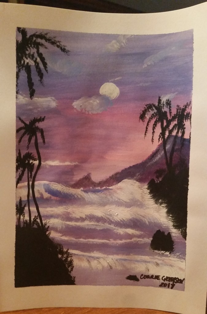 My grade four teacher taught me to crochet – what was supposed to be a hot mat turned into a pig (I kept dropping stitches) but I eventually figured it out and have made everything from blankets to clothing, with patterns and without. My sister taught me to paint – she taught herself by trial and error and while I still can’t paint trees very well, I derive a lot of pleasure from trying. I’ve taken a couple drawing classes as well and find it amazing what a person can do with a little will and a touch of inspiration!