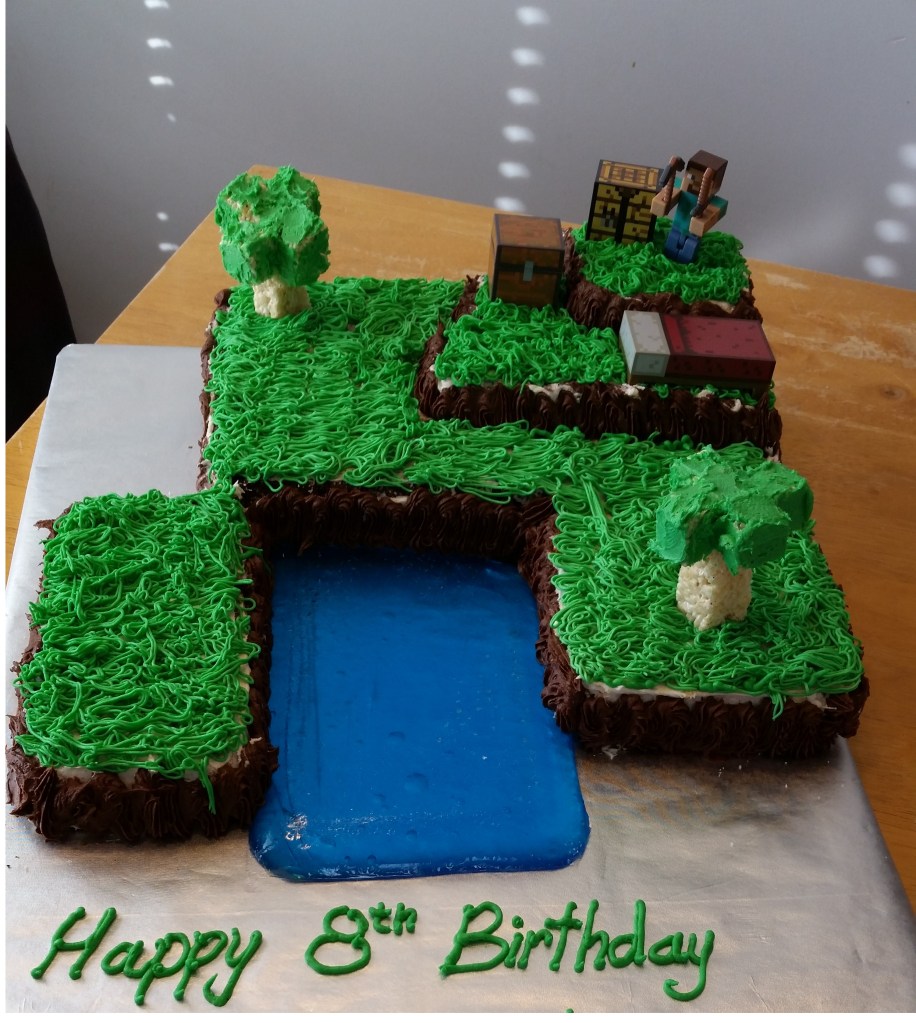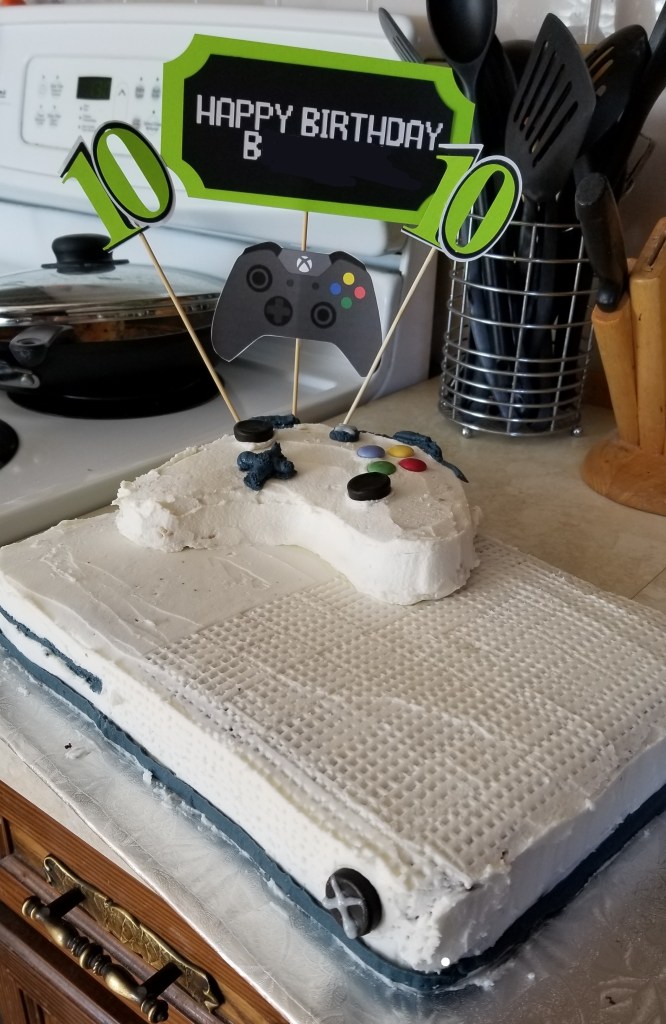 His first was Pocoyo. Second – Mega Blocks. Third – dinosaurs. Fourth – race cars. Fifth – monster trucks. Sixth – Super Mario. Seventh – Pokemon. Eight – Minecraft. Nine – I don’t think we did a party. Ten – Gaming with Lil BG. Eleven – Fortnight. Twelve was supposed to be a Switch Gaming party, but we had to cancel it because of the Covid outbreak. After that, he kind of outgrew Mom thrown parties.